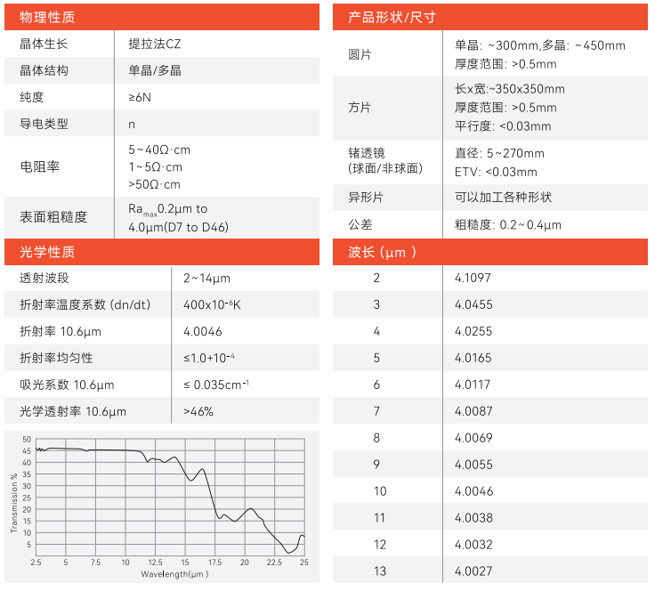 鍺折射率高、紅外透過波段范圍寬、吸收系數小、色散率低、易加工,是制作紅外光學鏡頭和紅外光學窗口最常用的材料。同時由于其在紅外光譜極好的透光性和在可見光譜的不透明性,非常適合用于制造在紅外激光和紅外熱成像領域應用的光學元件,可用于重大民用中熱成像儀、紅外雷達及其他紅外光學裝置中制作窗口、透鏡、棱鏡與濾光片的材料。