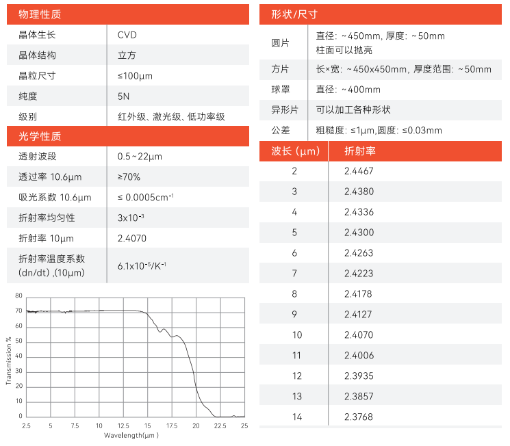 硒化鋅(ZnSe)是一種光學材料,具有純度高、環境適應能力強、易于加工等特點。可廣泛應用于激光系統和紅外熱成像系統,光傳輸損耗小,具有很好的透光性能。硒化鋅在10.6μm,吸收率比較低,是高功率CO2激光光學元件的首選材料。同時,硒化鋅也可應用在各種聚焦鏡、窗口材料、輸出耦合和擴束鏡。由于其卓越的光學性能,在其整個透光范圍內,成為不同光學系統中所普遍使用的材料。廣泛應用于激光、醫學,天文學和紅外夜視等領域中。光智科技擁有專業的技術和多年的生產經驗,長期為國內外多個知名公司供應高質量的硒化鋅毛坯料及光學鏡片。