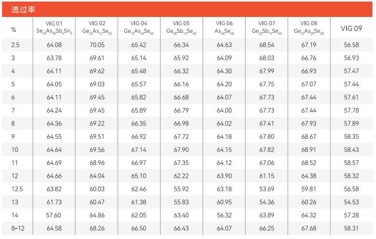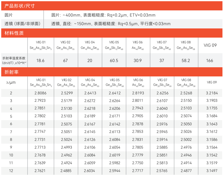 硫系玻璃具有優越的折射率均勻性和穩定性,是實現2-12μm范圍內紅外光學鏡頭色差校正和避免熱散焦的理想光學材料。同時由于硫系玻璃較低的熱轉變溫度和穩定的化學性質,可使用精密模壓的方式加工制造硫系玻璃鏡片,為大規模批量化生產提供了便利條件。硫系玻璃主要應用于監控設備及系統、海洋/船舶、消防/警用、傳感器、紅外產品。 光智科技生產高純度、高均勻性以及各種不同組分、尺寸的高品質硫系玻璃,主要包括Ge-As-Se、Ge-Sb-Se、As-Se 等系列產品。硫系玻璃的加工方式多樣,可通過模壓,機械加工,拋光等工藝制造平面、球面、非球面等產品。